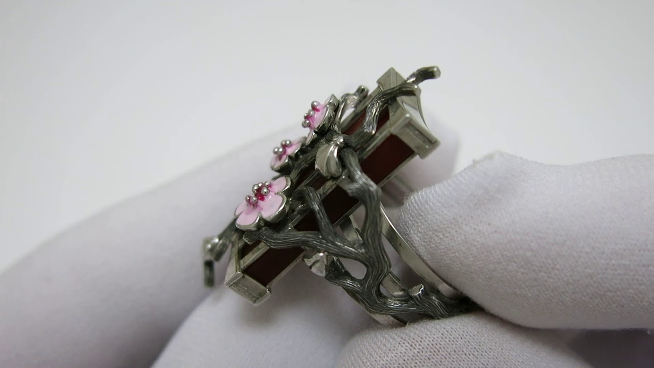 Кольцо сделано из серебра 925 пробы. На кольцо нанесено покрытие из родия. Кольцо раскрашено ювелирной эмалью. Камень-сердолик. Вес-10.7гр. Размер-18,5.