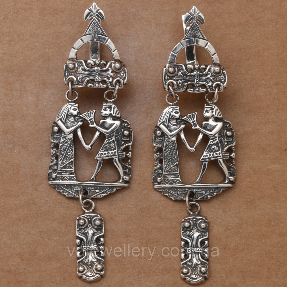 Оформить заказЖенские серьги. Серьги сделаны из серебра 925 пробы. На серьги нанесено чернение.Длина-6.5см,ширина-1.9см. Вес-11.5гр.