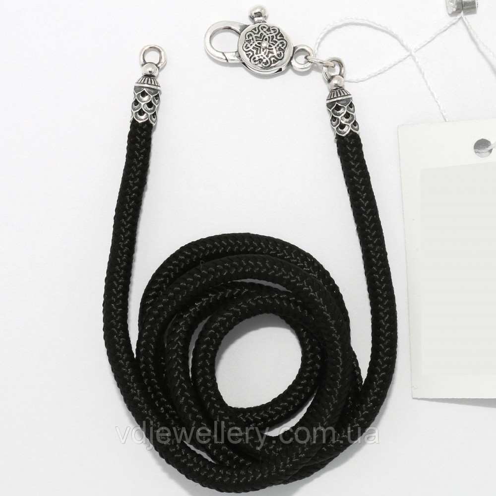 Шнурок с серебряным замком. Шнурок для крестиков, ладанок, кулонов, подвесок. Шнурок сделан из синтетической ткани. Замок и окончания сделаны из серебра 925 пробы. На серебро нанесено чернение.Толщина шнурка-3,5мм. Вес-3гр. Длины: 45-50-55-60-65см.