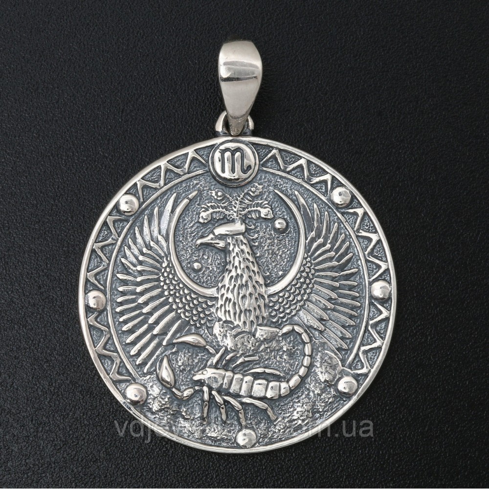 Серебряная подвеска знак зодиака Скорпион.Кулон сделан из серебра 925 пробы.На кулон нанесено чернение.Ширина(диаметр)-2.7см.Вес-7гр.