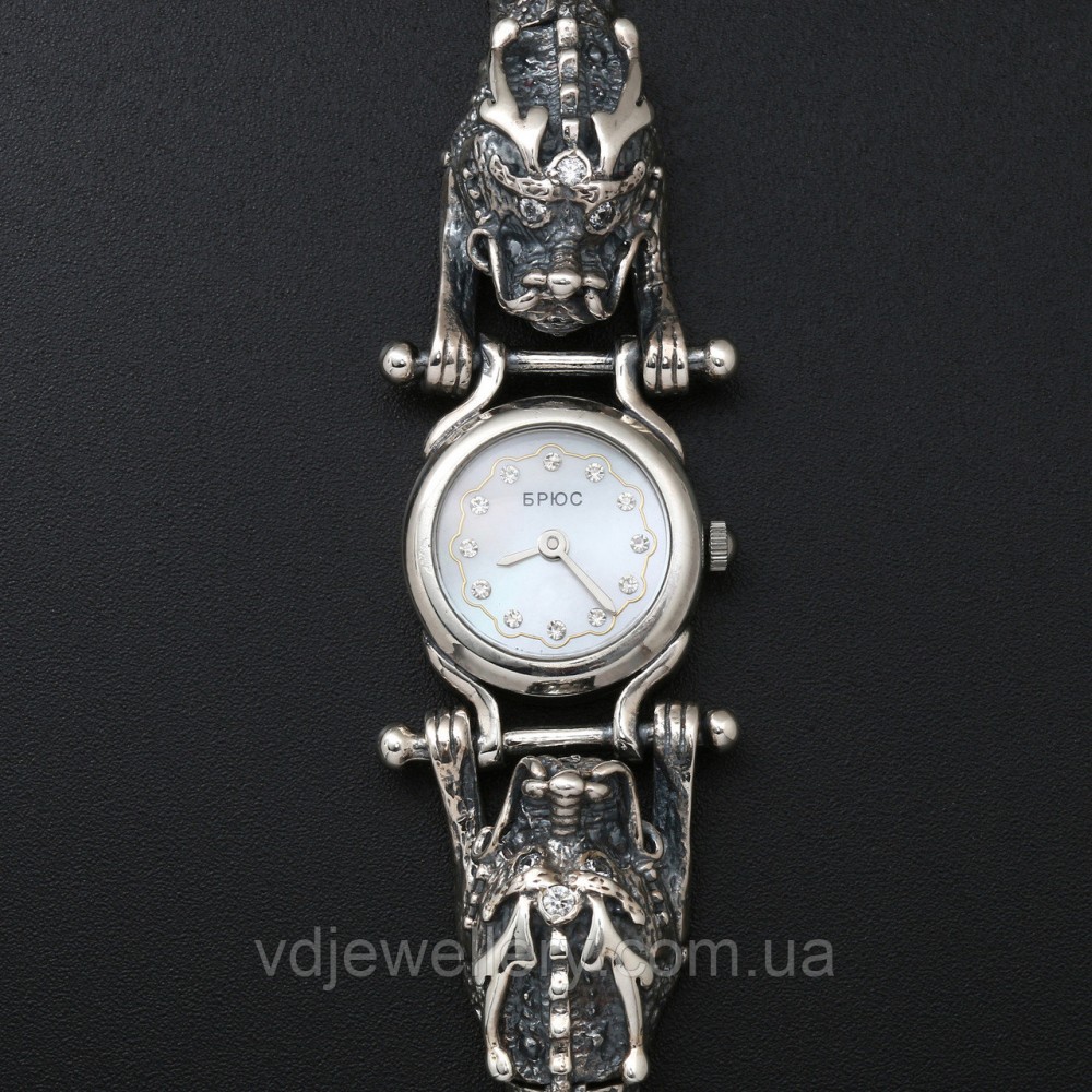 Жіночі срібний годинник. Годинник та ремінець зроблені з срібла 925 проби. На годинник нанесено чорніння. Кварцовий механізм. Камені куб. цирконію(фіаніт). Вага-33гр. Довжини: 17-18-19-20-21-22-23-24см. Виробник на свій розсуд може змінювати циферблат.