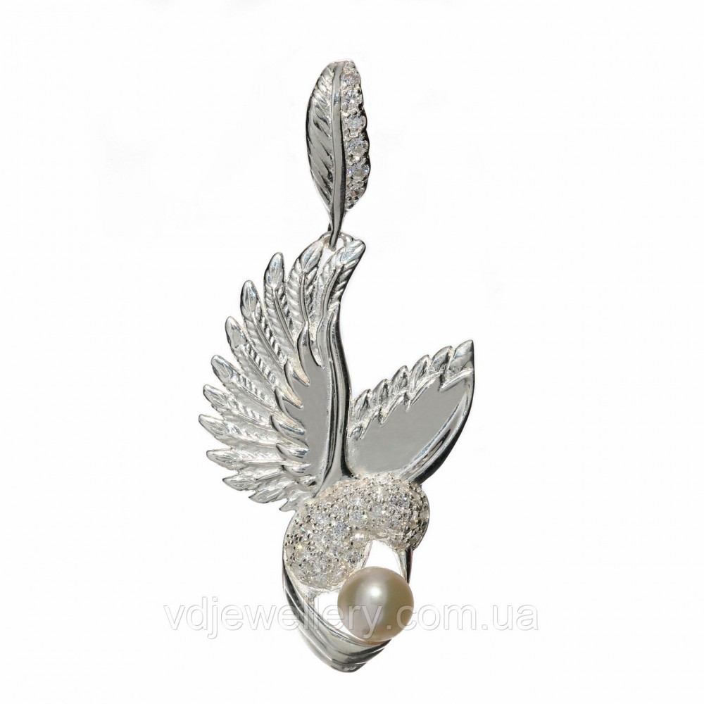 Кулон зроблений з срібла 925 проби. На кулон нанесено покриття з родію. Камені-перли і фіаніт. Вага-5.3гр.