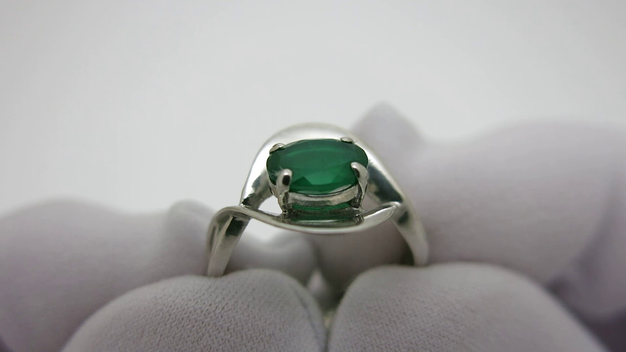 Жіноче кільце. Кільце зроблено зі срібла 925 проби. На кільце нанесено покриття з родію. Камінь-зелений онікс. Вага-2.2гр. Розміри: 16-17-18-19-20.
