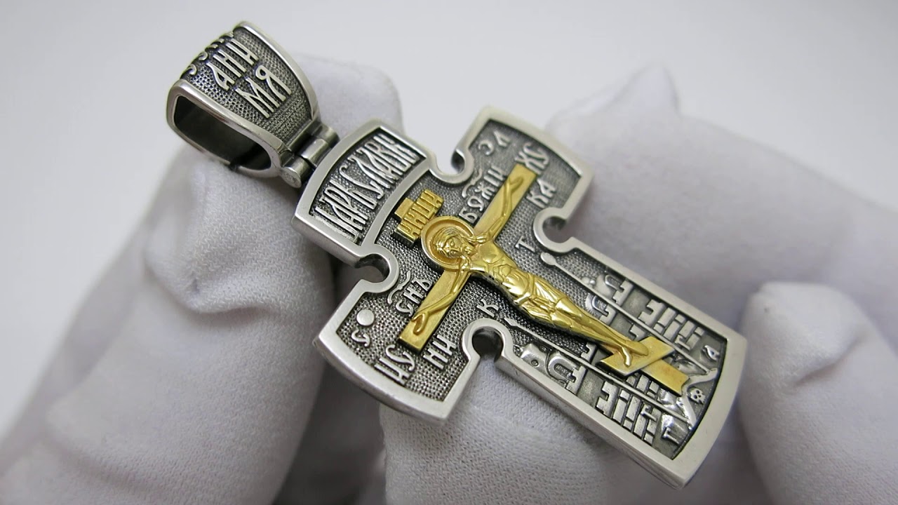 Хрест "Архангел Михаїл". Хрест зроблена зі срібла 925 проби. На хрест нанесено покриття з чорного родію і золота 900 проби. Довжина-5.3 см, ширина-3см. Вага-13.7 гр.