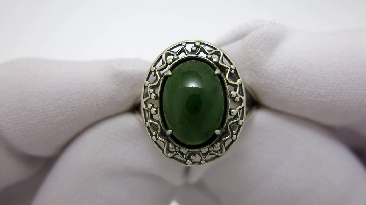 Кільце зроблено зі срібла 925 проби. Камінь-нефрит. На кільце нанесено чорніння. Вага-4гр. Розміри: 16-17-18-19-20.