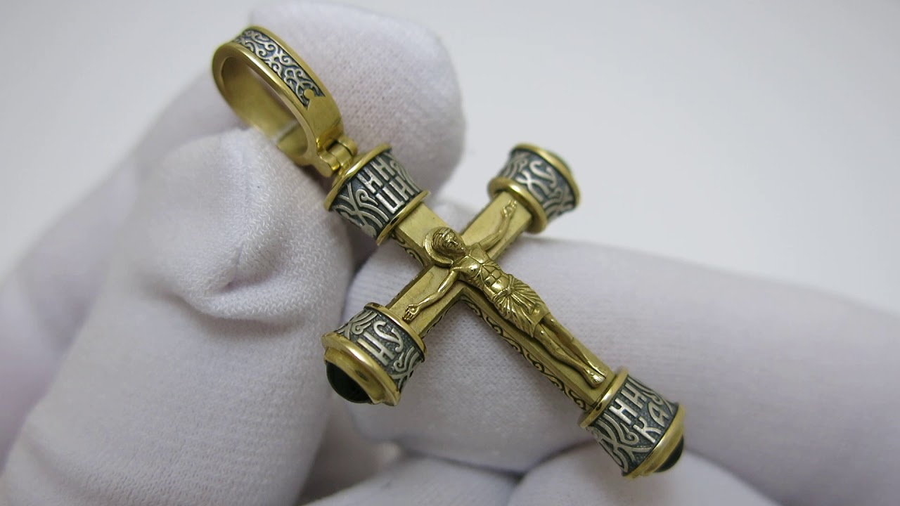 Хрестик зроблений з срібла 925 проби. На хрестик нанесено чорніння і покриття із золота 585 проби. На хрестику стоять камені онікс.